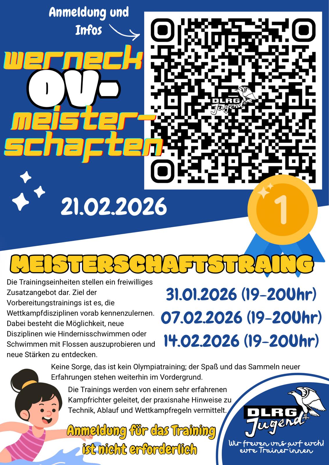 Wie in den vergangenen Jahren laden wir euch auch 2026 herzlich zu den Ortsverbandsmeisterschaften ein! Der Wettkampf findet am Samstag, den 21. Februar 2026, ab 17 Uhr im Hallenbad Werneck statt. Bitte beachtet, dass an diesem Tag kein reguläres Training stattfindet. Es handelt sich hierbai ausschließlich um einen vereinsinternen Wettkampf. Die Kinder schwimmen also nur gegen andere Kinder ihrer Trainingsgruppen.